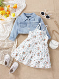 3-Piece Girls’ Outfit – Floral Dress, Halter Top & Denim Shorts Set
